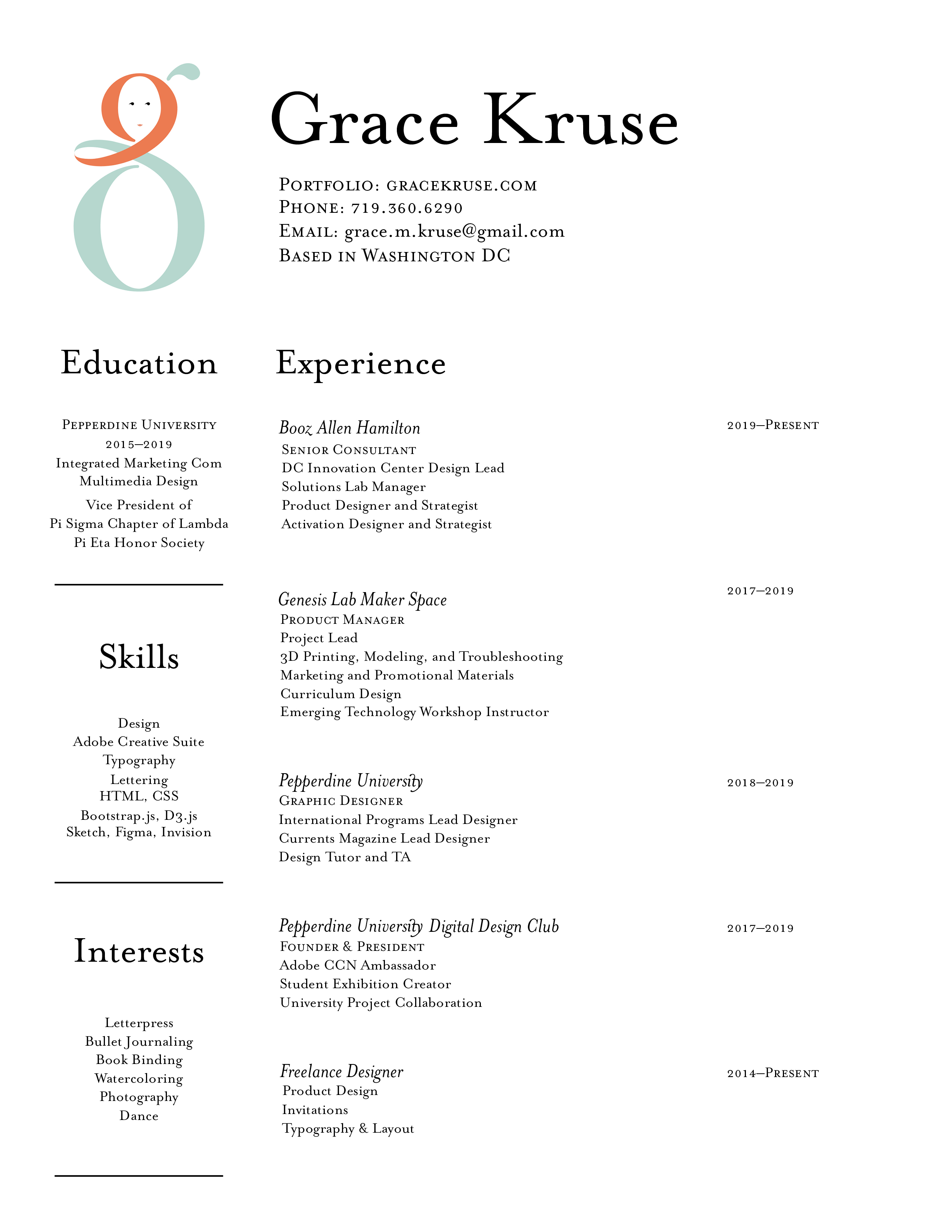 Hi, my name is Grace Kruse. I love the color blue, whether it’s cyanotype or cheese. I come from a family of nine kids so before COVID-19, I did my best work in noisy coffee shops with plenty of distractions. With those important facts out of the way, I'll tell you a bit about myself. I graduated from Pepperdine University in 2019 which brought me to the best of all possible worlds. It allowed me to study in London, analyze some of the worlds finest books and discover my love for design. In the fall of 2017, I began working as a designer along with emerging technology. Throughout the years I have found myself the most inspired and doing my best work at the convergence of my passions like, design, art, science, and technology. Whether creating a type specimen for Mrs. Eaves, or leading a team to code a Harry Potteresque moving portrait, I am a creator through and through.